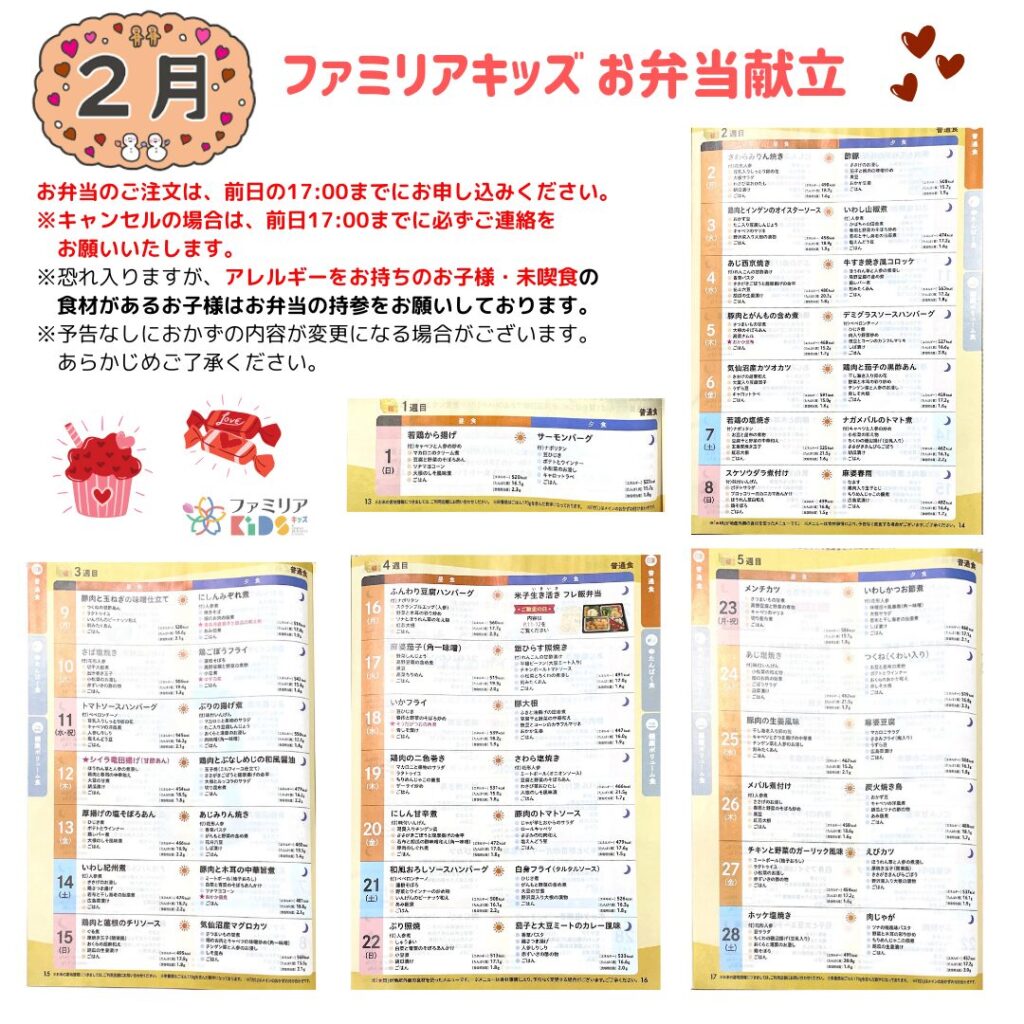 2月のお弁当献立表 - ファミリアキッズ by Tokyo Business Clinic【公式】東京駅八重洲北口 千葉駅 一時預かり託児所