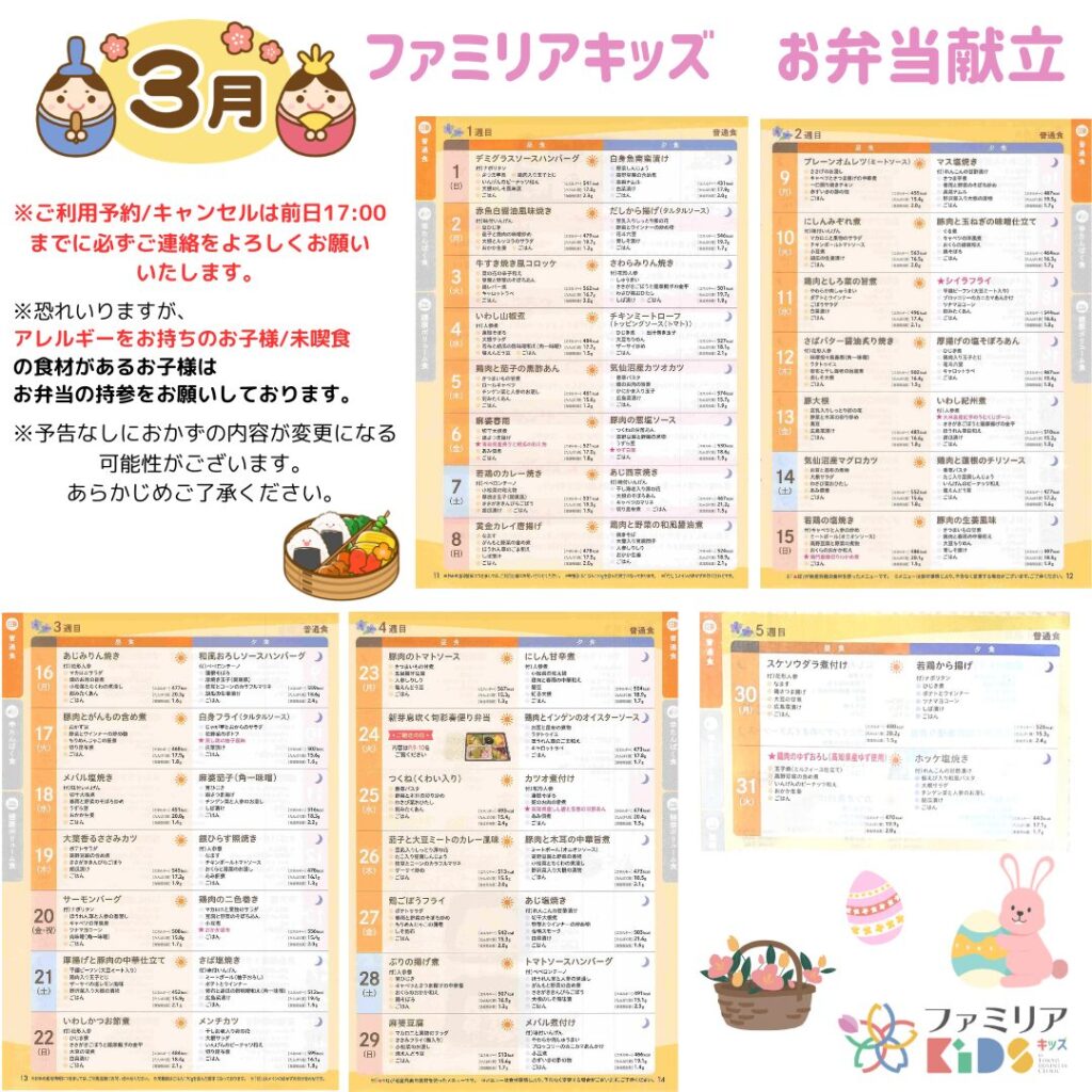 3月のお弁当献立表 - ファミリアキッズ by Tokyo Business Clinic【公式】東京駅八重洲北口 千葉駅 一時預かり託児所
