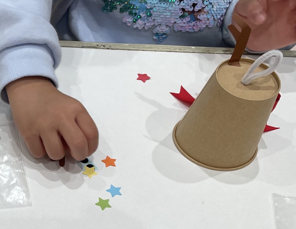 紙コップの中に大きな鈴がついていて、、出来上がったベルを振って「りんりん〜」と音を鳴らすことを楽しむ姿も見られました🔔