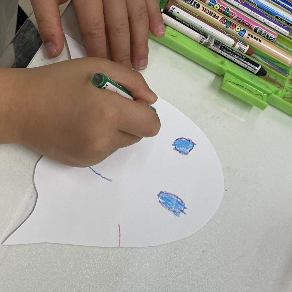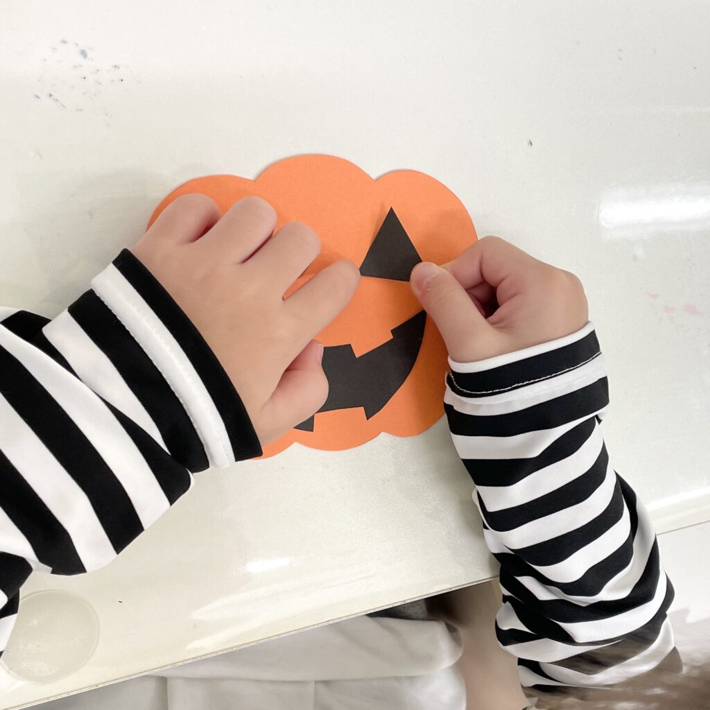 製作では、おばけやカボチャの顔をシールで作っていくのですが、お兄さんお姉さんの中には「自分で描いていい?」と自ら提案して、お絵かきで個性豊かに顔を完成させるお子様もおりました✨️