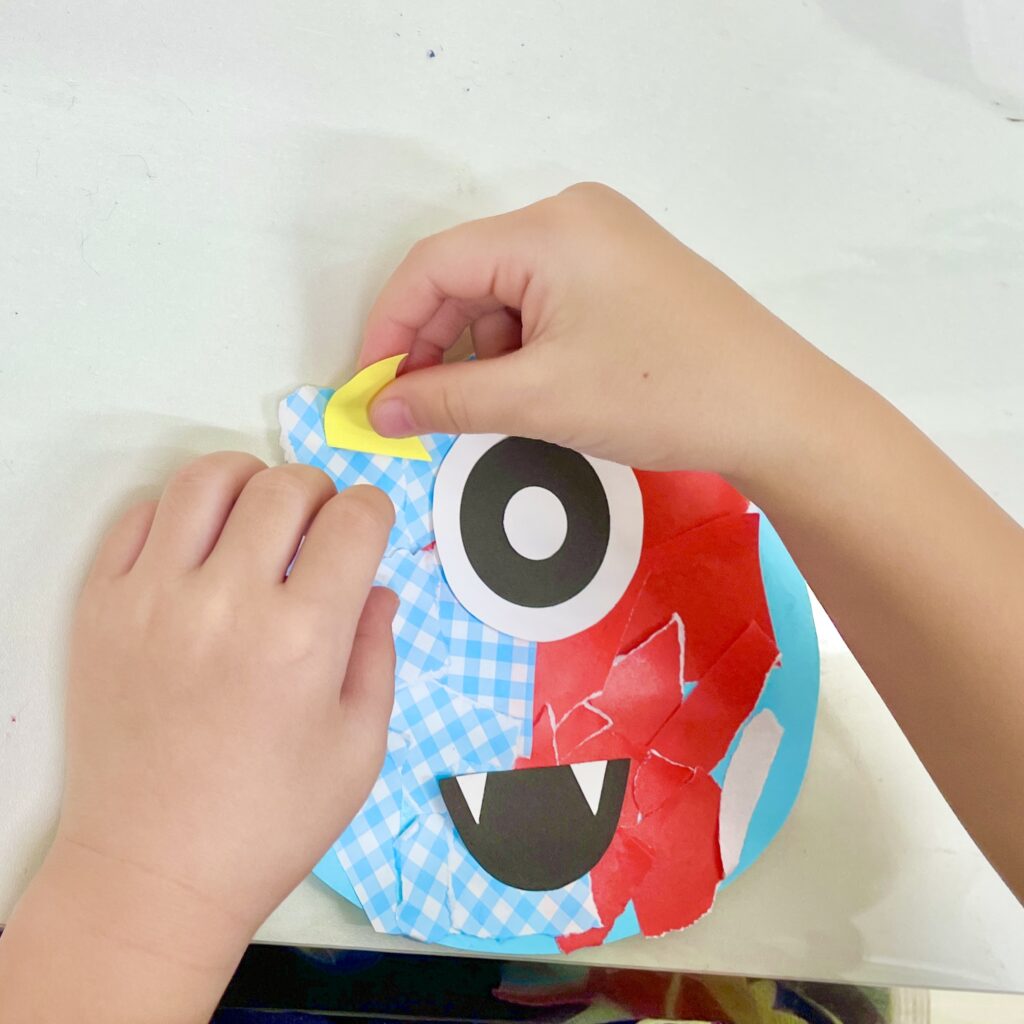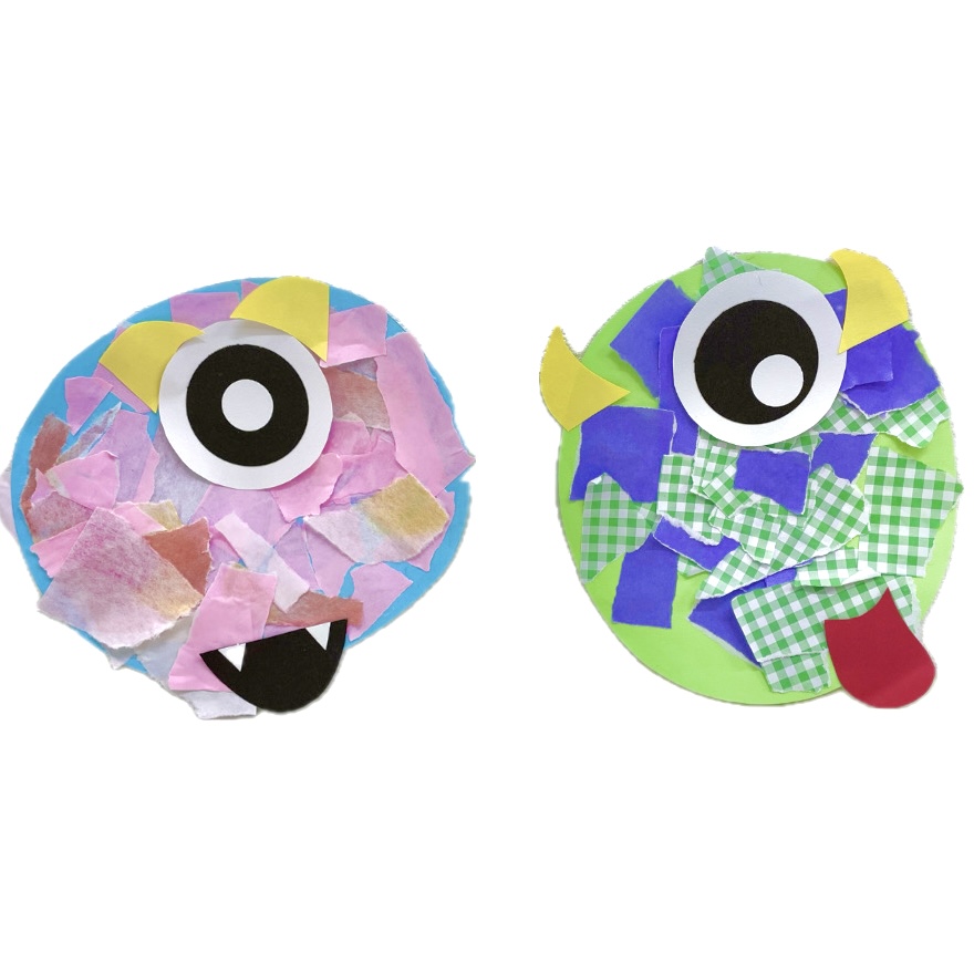 そんなモンスターのカラフルなイメージを柄の折り紙をちぎって貼り付けることで表現してみました。
