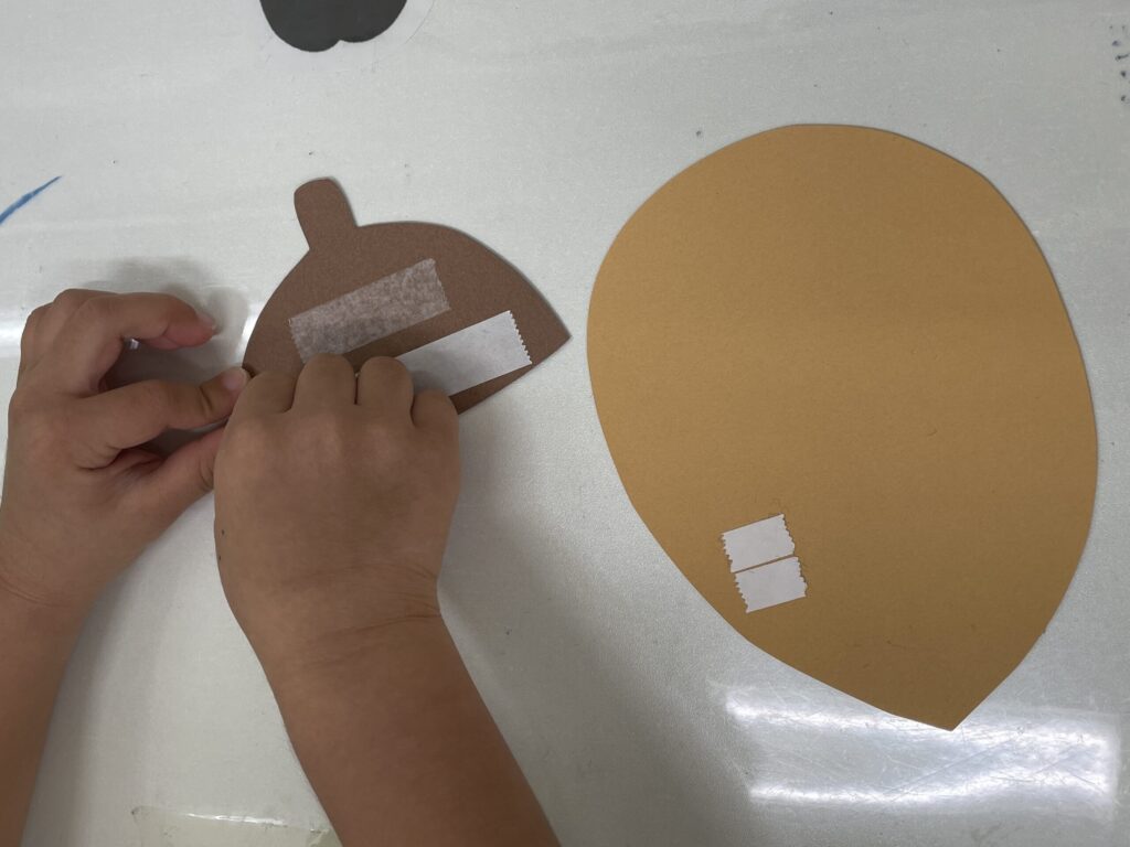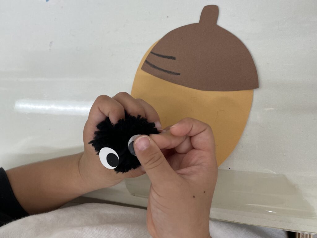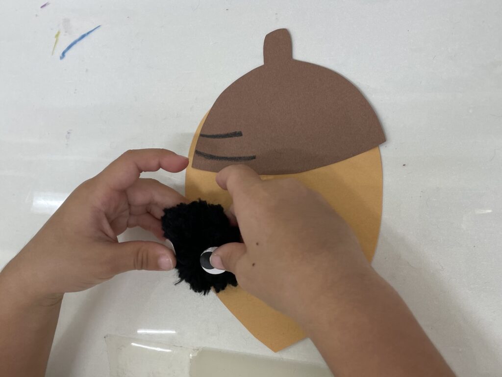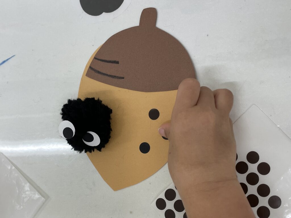 どんぐりに黒い丸シールを貼って、虫食い穴を再現するお子さまもおりました!